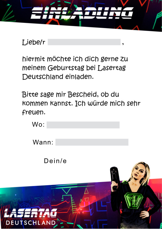 Hier findet ihr einige Einladungsvorlagen für eure Geburtstagsparty bei LaserTag Köln! Vergesst auch nicht die Einverständniserklärung mitzubringen!
